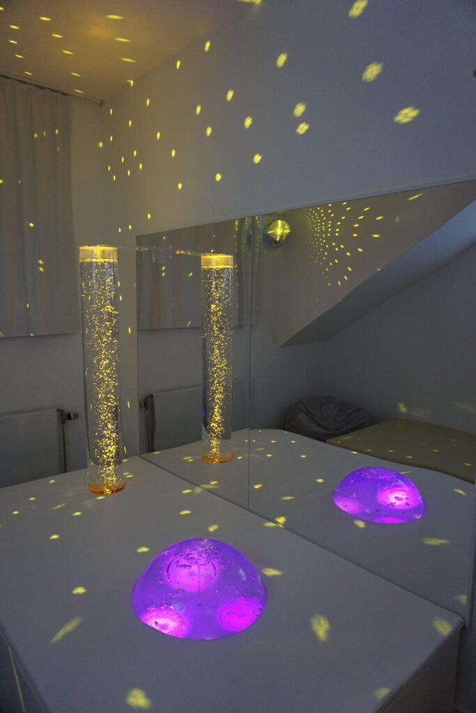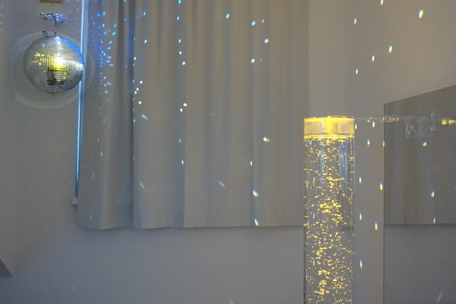 Nach viel Planung, Gespräche über Angebote und schließlich die Umsetzung durch die Firma Sport-Thieme ist unser Ruheraum endlich fertig. Es gibt 4 Hauptelemente mit einem Projektor, einer Discokugel, einer Wassersäule und einer Glaskuppel. Hier können die Kinder sich ausruhen, abschalten, Bücher anschauen oder eine Geschichte hören.
